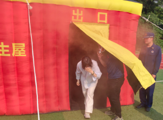 在操场搭建的模拟方舱内,师生分组体验了密闭空间火灾逃生。舱内释放无害烟雾,模拟真实火场的低能见度和浓烟环境。参加演练师生在安全员引导下,凭借触觉和有限视线摸索逃生路线。参加演练的各相关部门负责人及工作人员、保卫处全体工作人员及保安队员共同参加此环节演练。
