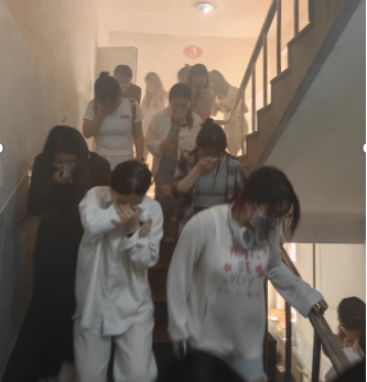 下午15:00,随着消防警报响起,2号、4号寝室楼的疏散演练正式开始。模拟场景为5层某寝室因充电器过热引发“火情”,浓烟迅速蔓延。参加演练师生在疏散引导组的指挥下,弯腰低姿、用湿毛巾捂住口鼻,沿墙有序撤离至安全集合点。