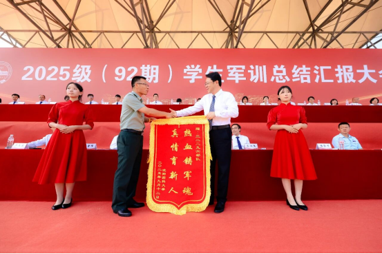 高明宇代表学校向承训部队赠送锦旗,对全体教官的严格施训和辛勤付出表示衷心感谢。历时三周的军事训练中,2025级(92期)学生完成了单兵队列、纪律条令等十大科目的“通识通训”,掌握了基本军事技能,强化了纪律意识;通过六公里野外拉练,以及“防空紧急疏散”“染毒地带穿越”等实战化演练,锤炼了意志品质,体现出“流血流汗不流泪,掉皮掉肉不掉队”的军人作风。