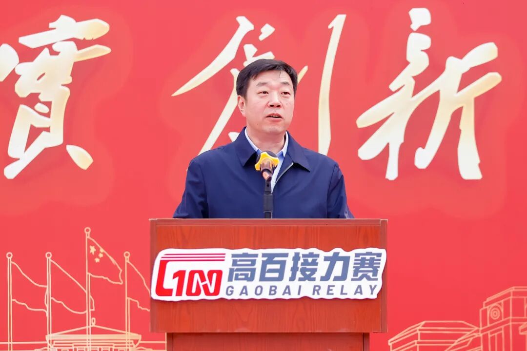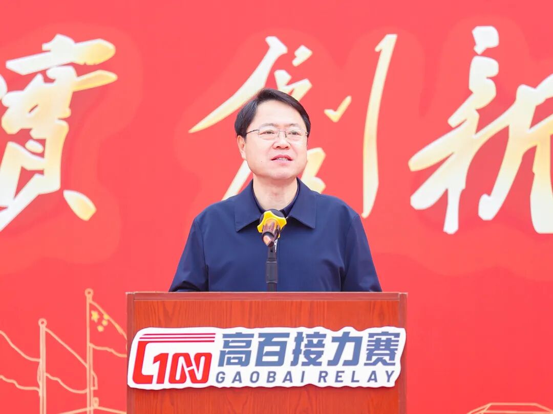 杨海在讲话中提到,高百接力赛是用体育赛事激发学生的团队意识和拼搏精神的生动体现,作为教育强省建设的重要举措,辽宁省始终秉持 “健康第一” 的教育理念,将体育育人贯穿教育全过程,希望运动员们能在竞技中学会尊重对手、超越自我,在拼搏中展现当代大学生团结协作、自强不息的风采。