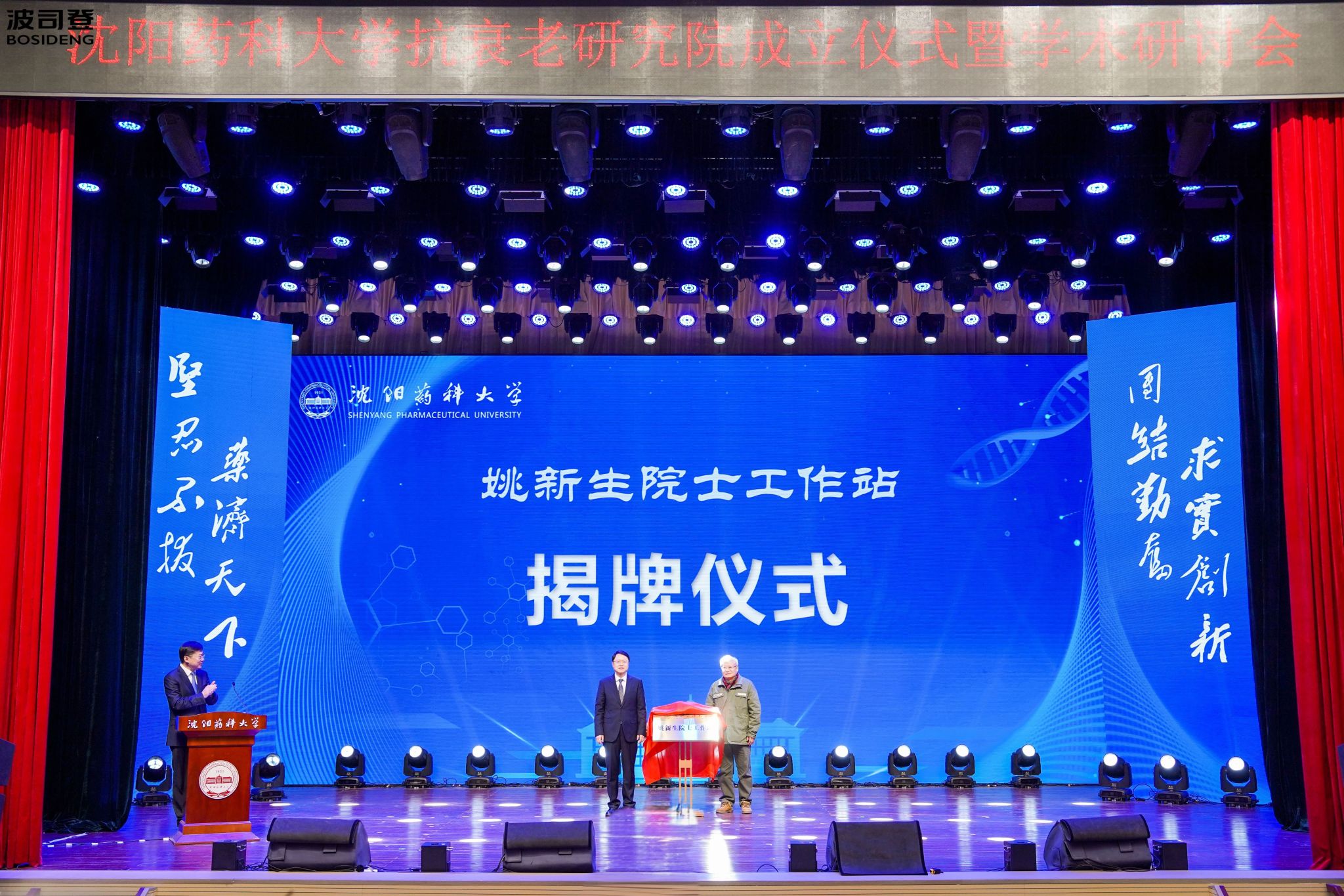 在揭牌环节,沈阳药科大学姚新生院士工作站、支持单位、共建单位揭牌仪式顺利举行。