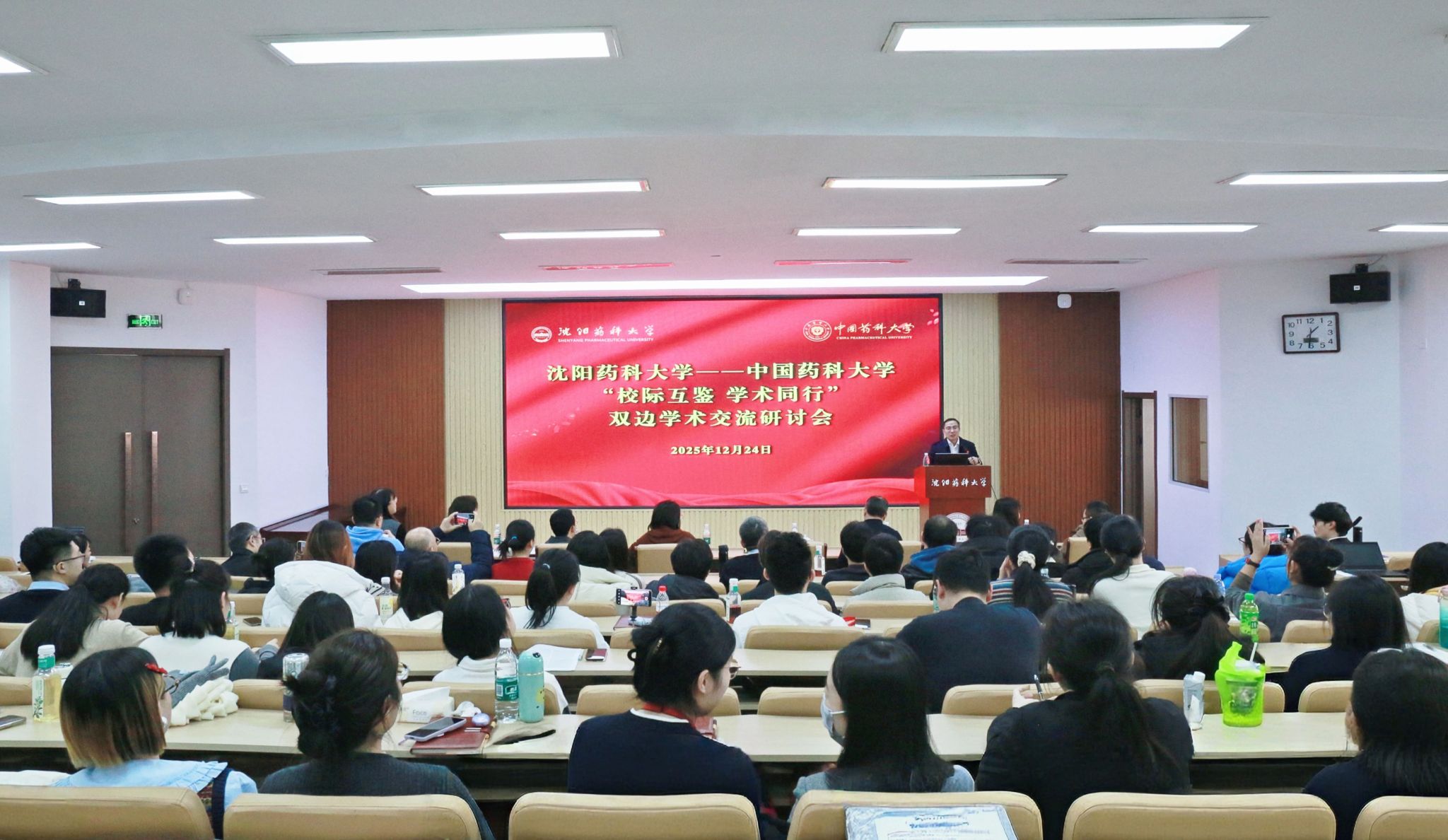 12月24日,沈阳药科大学-中国药科大学“校际互鉴 学术同行”学术交流研讨会在沈阳药科大学沈阳主校区图书馆五楼第一学术报告厅成功举行。本次研讨会邀请中国药科大学中药学院秦贤进研究员、张蕾教授,我校制药工程学院陈国良教授与师生作报告交流。校党委副书记、校长齐炼文出席研讨会。会议由科研处处长张嵘、教师发展中心主任李清主持。