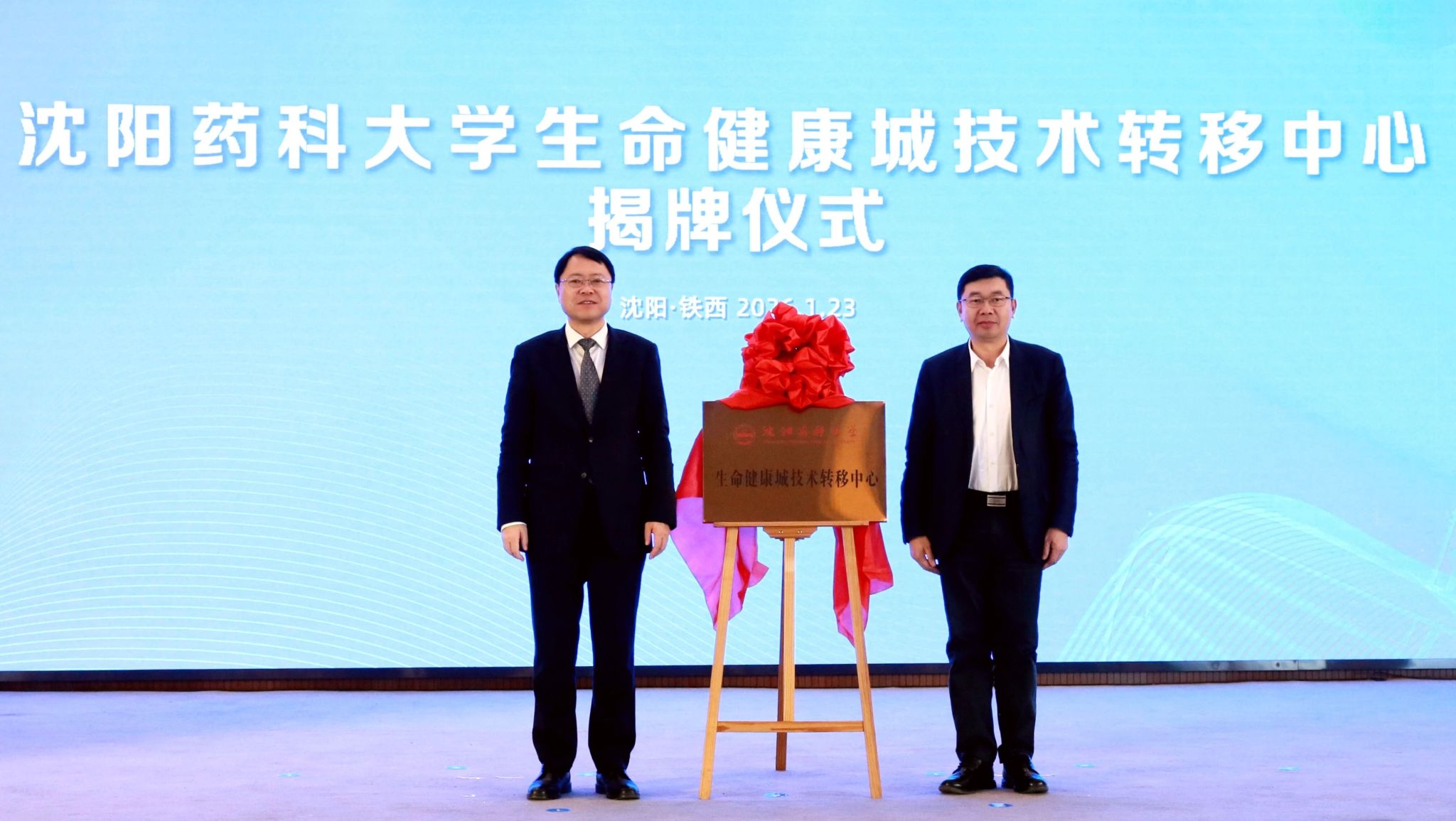 在热烈的掌声中,高明宇与铁西区委书记,经开区、中德园党工委书记郭忠孝共同为沈阳药科大学生命健康城技术转移中心揭牌。中心将紧密对接沈阳国际生命健康城的战略布局与发展需求,构建高效的技术转移转化与产业服务体系,努力打通从实验室研究到产业化应用的“最后一公里”。